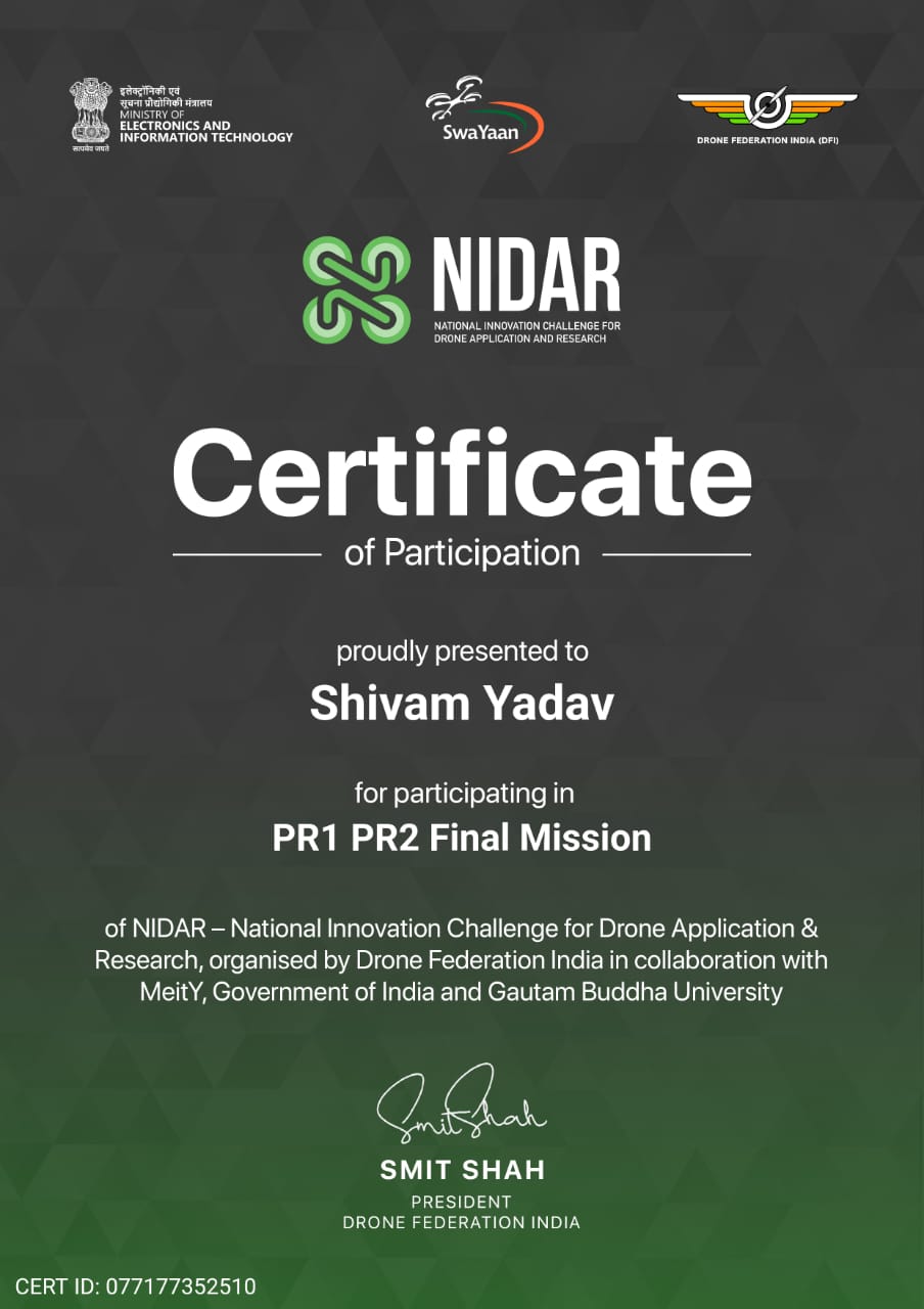 Competed in India's largest drone innovation challenge hosted by Ministry of Electronics & IT (MeitY) and Drone Federation India. Built dual autonomous drones for disaster management with ML-based survivor detection, custom Python GCS, and 30-hectare autonomous coverage. Finals held at Gautam Buddha University, Greater Noida (January 10-16, 2026).